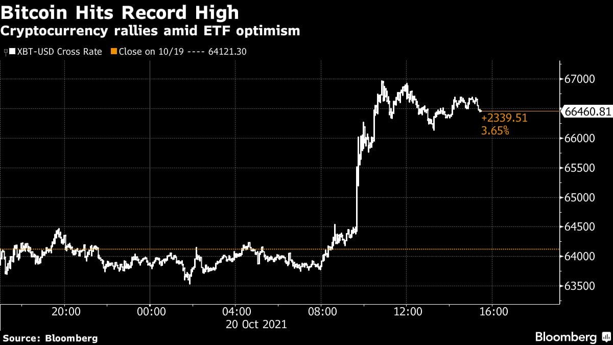 New York: Bitcoin rallied to a record, topping $66,000 for the first time as optimism surged for greater mainstream acceptance in the wake of the successful launch of the inaugural exchange-traded fund for U.S. investors.