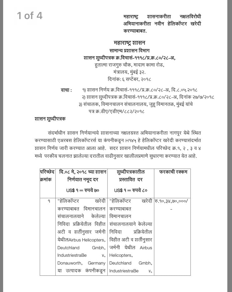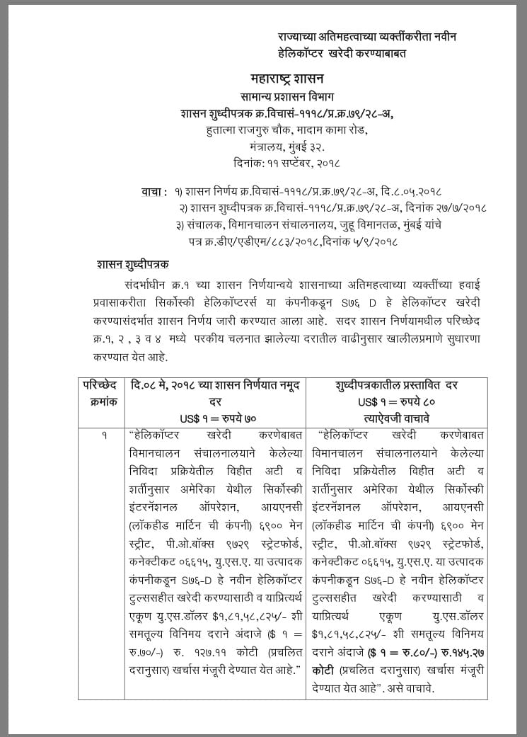 Devendra Fadnavis-led BJP govt revises costs of two choppers it was to buy, calculating new amount after pegging the rupee at Rs 80 to the dollar.