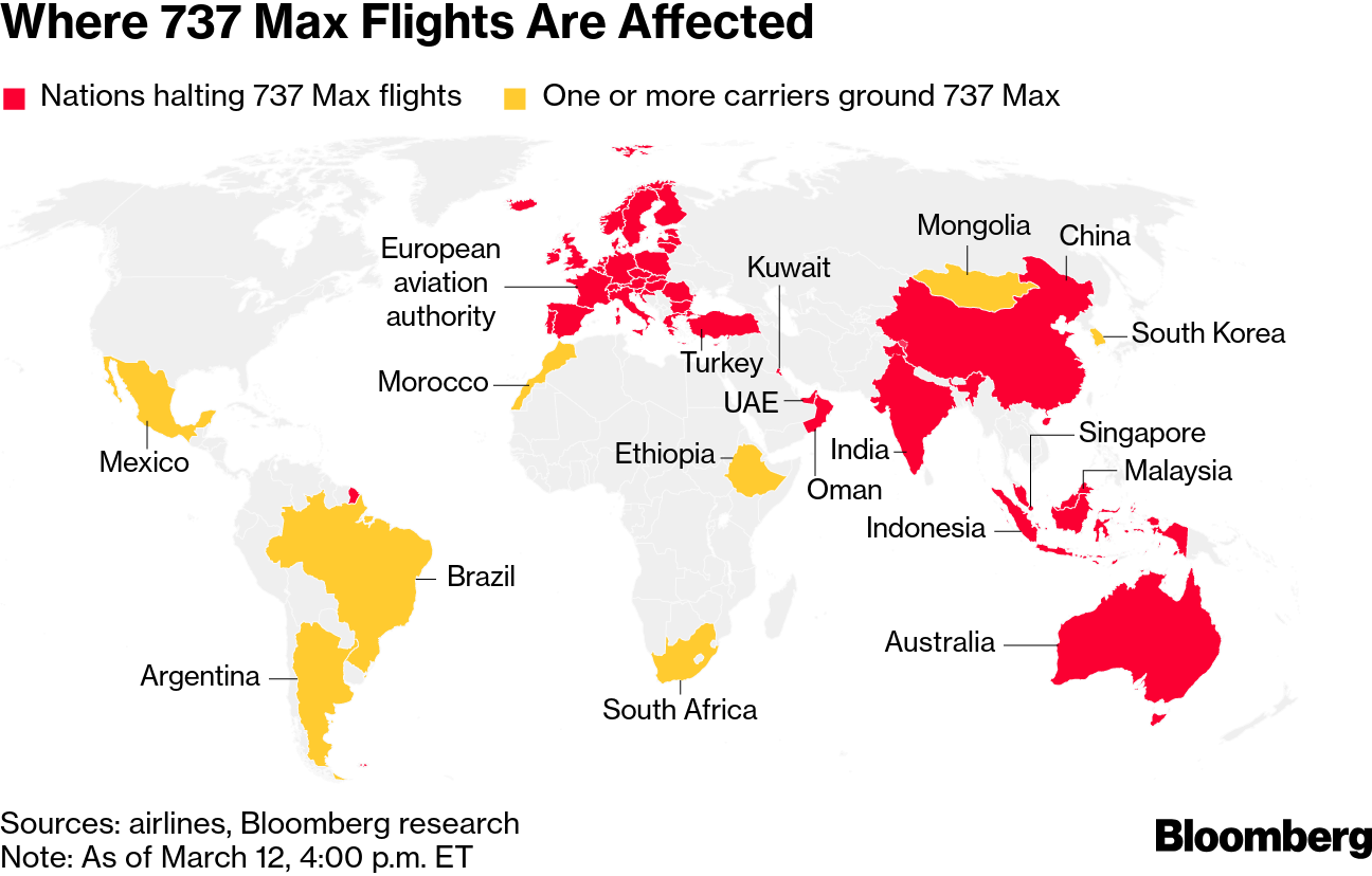 The global rush to halt flights is leaving Boeing and the U.S. Federal Aviation Administration isolated a day after they expressed confidence in the jetliner’s airworthiness. Jurisdictions including China, Australia and Singapore had already grounded the Max, as had airlines from Latin America to Africa and the Middle East. But the spread of the ban to Europe deals another big blow to Boeing as it grapples with the aftermath of the African tragedy.