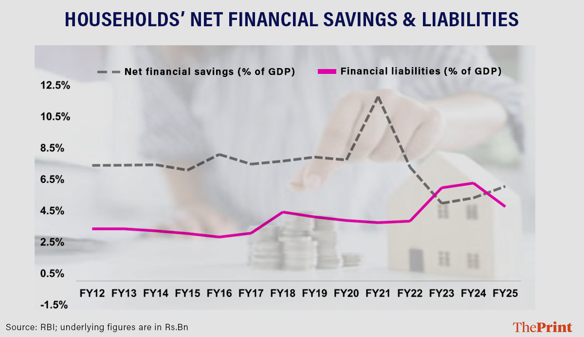 The good news is that net household savings rose as a percentage of GDP in FY25, largely because of a slower increase in liabilities (see chart below), a fact also echoed by some of the country’s largest banks, which say their loan book growth slowed down significantly in FY25.
