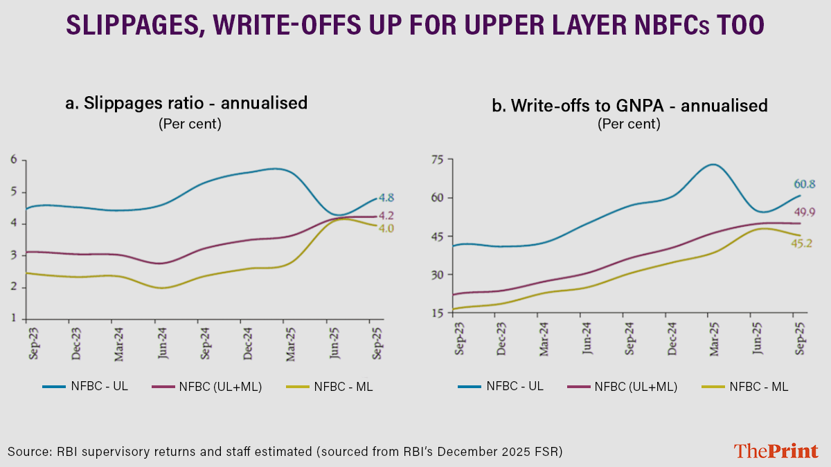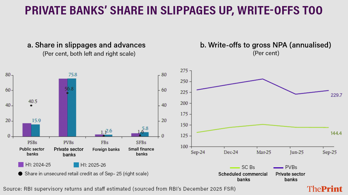 Currently, India’s banks and non-bank lenders (NBFCs) have good asset quality, but the banking sector has seen a rising share of slippages from March 2025 to September 2025. Further, for private banks, the percentage of loan write-offs to gross non-performing assets (GNPAs) increased too.