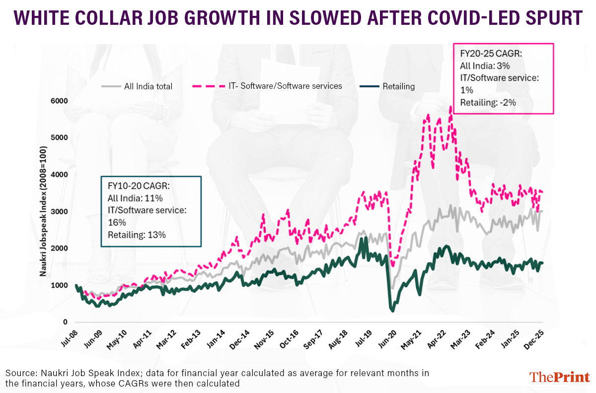 According to Naukri (India’s largest online classifieds business) JobSpeak index, job growth across all sectors was 11 percent per annum from FY10-20. After the pandemic (FY23-FY25), this rate slowed down to a mere 3 percent per annum.