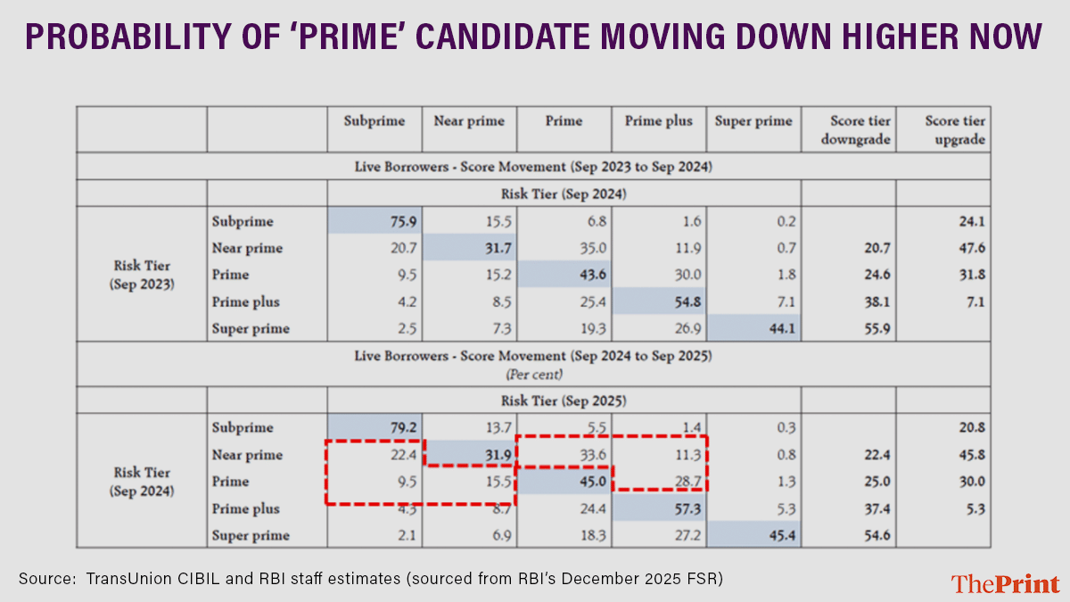 The RBI also included a transition matrix for different classes of borrowers (i.e., the probability of a prime customer going to near-prime, subprime, or to prime-plus and super-prime). What this shows is that the probability of credit scores deteriorating is increasing.