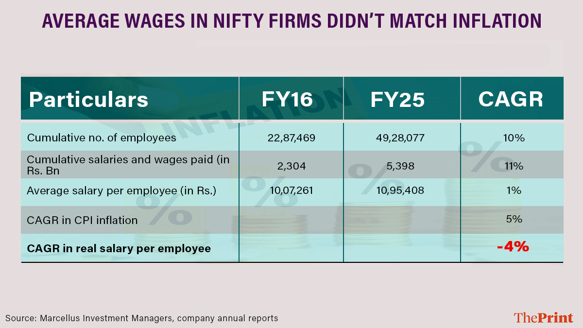 An analysis of Nifty companies (i.e., the largest companies in India by market capitalisation) also showed that salaries declined in real terms (i.e., adjusting for inflation) in the last nine years.