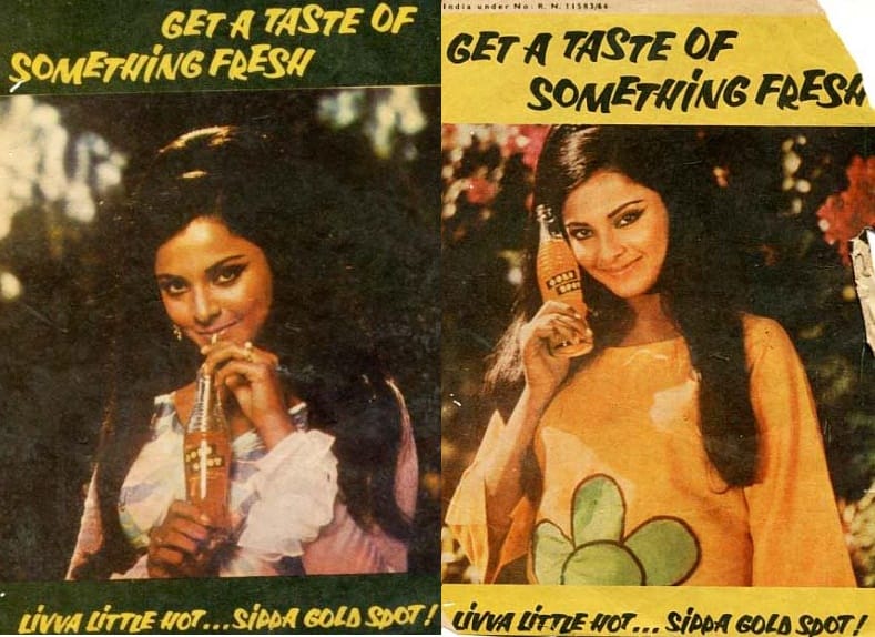 The print ad featuring a very young Rekha in a bright orange top with a floral print and had a tagline, “Get a taste of something fresh: Livva little hot, sippa Gold Spot”.