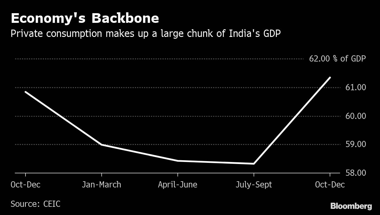 More cautious spending on everything from shampoo to cars and travel threaten to weaken what’s been the backbone of the economy, contributing about three-fifths of gross domestic product. The pullback has acted as a drag on growth, which is predicted to have slowed for a fourth consecutive quarter to 6.5% in the three months to March, the weakest pace since mid-2017 and almost on par with China.