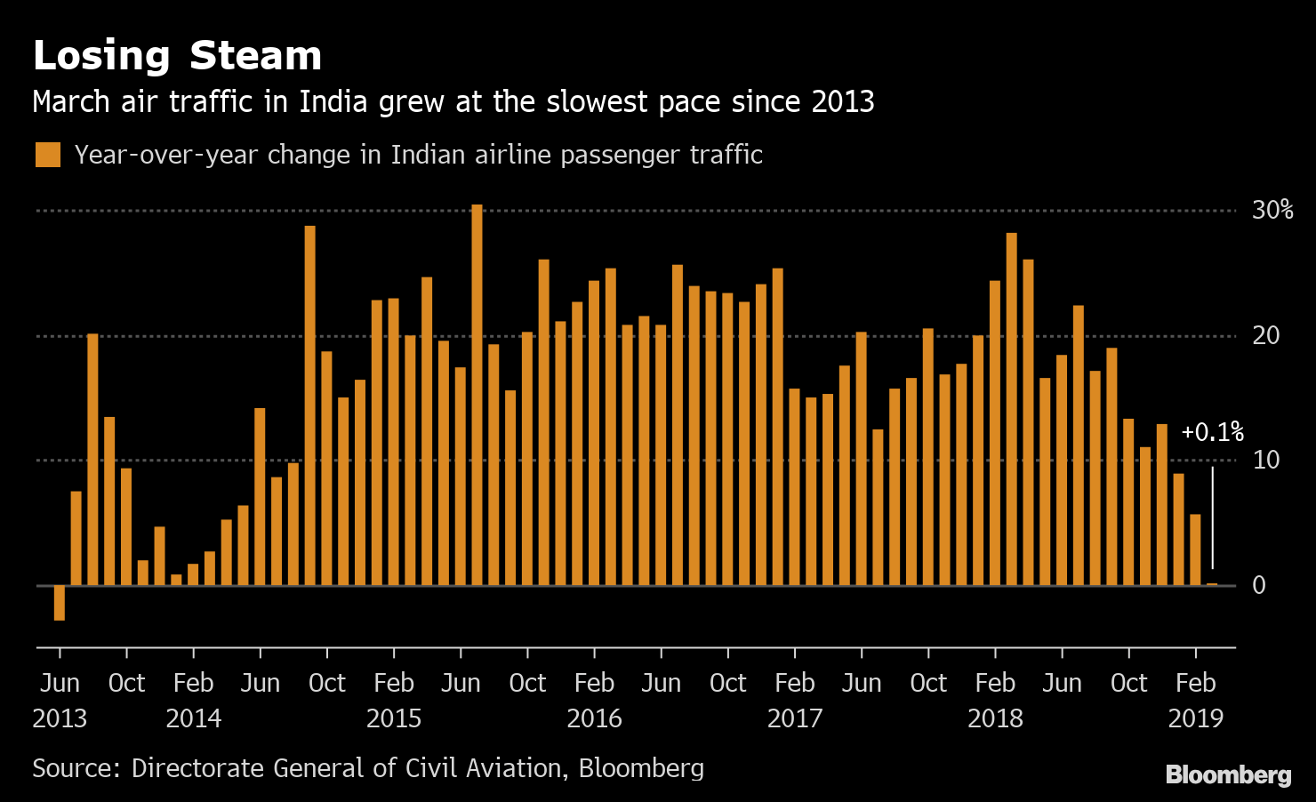 Air traffic in India, the world’s fastest-growing aviation market last year, expanded at the slowest pace in almost six years in March. Local airlines carried 11.6 million passengers in March, or 0.1% more than a year earlier. The slump came as Jet Airways India Ltd., once India’s biggest carrier by market value, was forced to suspend flights and seek a new investor.