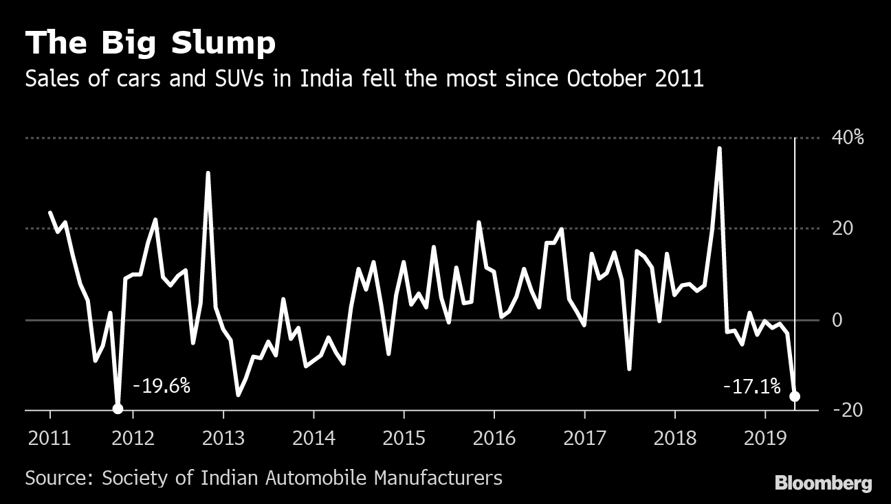 The automobile sector too is passing through a rough phase with passenger vehicle sales dropping in April by the most in seven-and-a-half years. Sumedha Dasgupta, an analyst at ICICI Bank Ltd., says a host of disruptions have roiled the sector including the recent cash crunch among shadow banks, patchy monsoons, high fuel costs and tightening insurance norms.