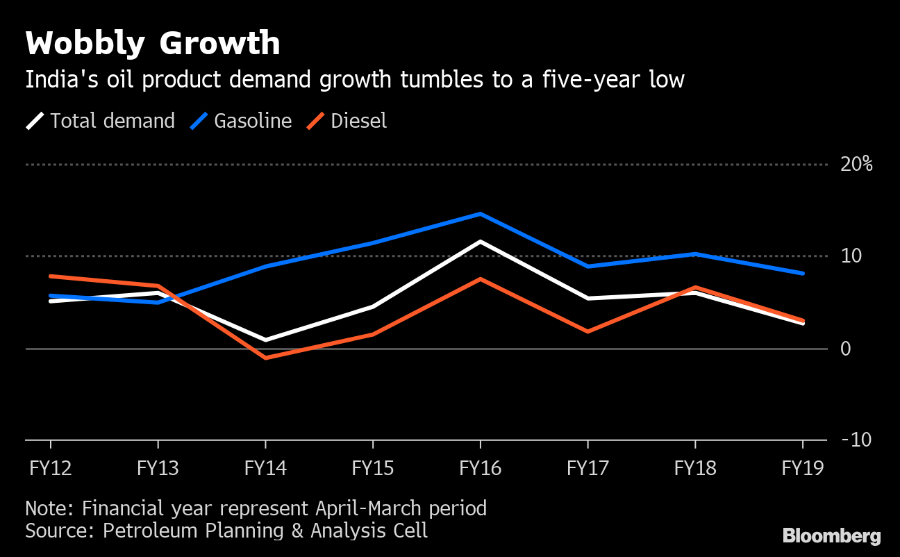 India’s oil demand growth in the 12 months through March was the slowest in five years. In April, the first month of the new financial year, oil product consumption remained little changed. Weaker industrial activity has hit diesel demand growth, while falling passenger vehicle sales impacted gasoline consumption. Going forward, a more than 30% surge in oil prices so far this year is likely to crimp fuel consumption and flow through into consumer spending as well.