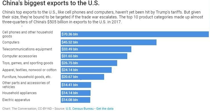 No list of all the goods that might be subject to tariffs has been released, but it would have to include consumer electronics, such as smartphones, which is the largest single product category in China’s exports to the US.