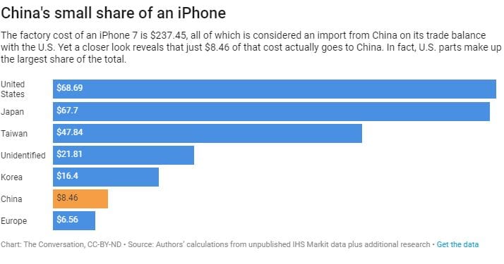 IPhone imports look like a big loss to the US, at least to the president, who argues that “China has been taking out $500 billion a year out of our country and rebuilding China.” One estimate suggests that imports of the iPhone 7 and 7 Plus contributed $15.7 billion to last year’s trade deficit with China.
