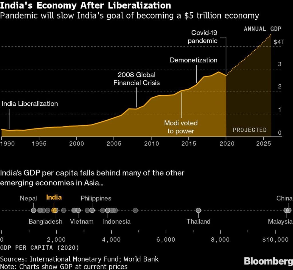 Modi had pledged to turn India into a $5 trillion economy by 2025, but the pandemic is set to push that back by years. The International Monetary Fund expects India to grow 6.9% in the next fiscal year that starts in April 2022, lower than the more than 8% needed long term to reach Modi’s ambitious target and create jobs for the millions entering the work force.