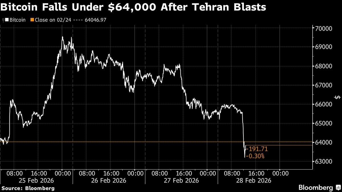 Bitcoin dropped as much as 3.8% to $63,038, before stablizing to trade around the $64,000 mark as of 6 a.m. in New York. Ether, the second-largest token, slid as much as 4.5% to $1,836. Roughly $128 billion in market value was erased across digital assets in the immediate aftermath of the news, according to data from CoinGecko.
