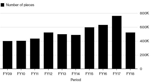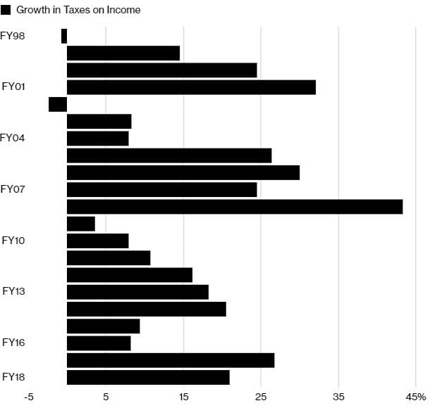 India saw a whopping 27 percent increase in personal income tax collections in the year to March 2017, the biggest jump in the past decade, and a solid 21 percent gain in the past fiscal year. That’s helped to underpin overall government revenue, but not enough to plug a budget shortfall as the government picks up spending in the lead up to an election due by May. The deficit target is 3.3 percent of gross domestic product for the current year, a goal that Finance Minister Arun Jaitley recently said will be met, given that revenue and asset sale targets are likely to be exceeded.