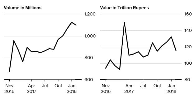 Part of the gain in tax income is due to the increase in new taxpayers that followed demonetization. Government data shows 10.1 million new taxpayers were added to the system in the year through November 2017 compared with an average of 6.2 million in the preceding six years.