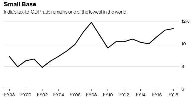 India still has a way to go though. While the number of taxpayers increasedalmost 30 percent to 82.7 million in the first three years of Modi’s rule, as a proportion of the $2.6 trillion economy, that base remains low. Even after the introduction of the goods-and-services tax and sophisticated tools to nab tax evaders, India’s tax-to-GDP ratio lingers around the levels seen a decade ago and is lower than the global average.
