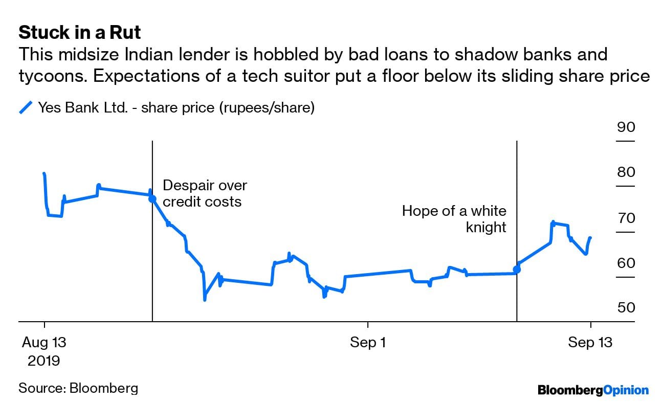 To avoid such a fate, Yes needs to raise growth capital by convincing new investors that the worst is over. And that brings us to the week’s other big incident. Yes shares jumped 13.5% after reports that One97 Communications Ltd., which owns the Indian digital payments network Paytm, may buy out a 9.6% stake in Yes from Rana Kapoor, the lender’s co-founder. Kapoor was forced to step down as CEO early this year by the Reserve Bank of India amid a controversy over bad-debt accounting. New CEO Ravneet Gill, brought in to clean up the mess, told Reuters last week that Yes was looking to sell a minority stake to “one of the world’s top three technology companies that had not previously invested in a bank.”