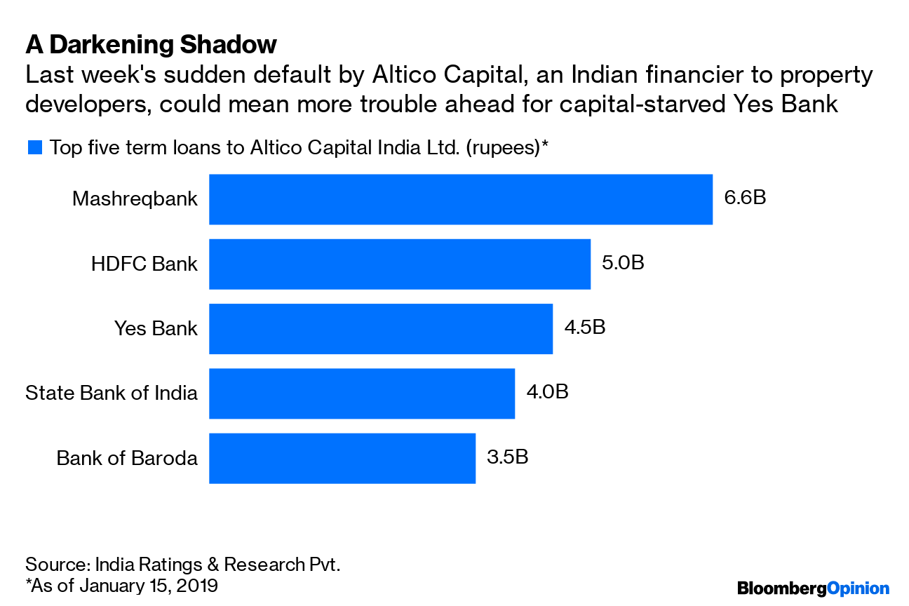Based on January data, the midsize Indian bank had a 4.5-billion-rupee exposure to Altico, the third-highest after Mashreq and HDFC Bank Ltd. While HDFC Bank, the country’s most valuable lender, has the capital — and current profit — to take the occasional credit hit, Yes’s capital cushion is already frayed by dodgy loans to beleaguered shadow banks and troubled tycoons. Both these borrower groups have found it hard to refinance debt since the collapse last year of IL&FS Group, a large Indian infrastructure financier and operator. Altico’s unraveling shows that an end to credit woes is not yet in sight.