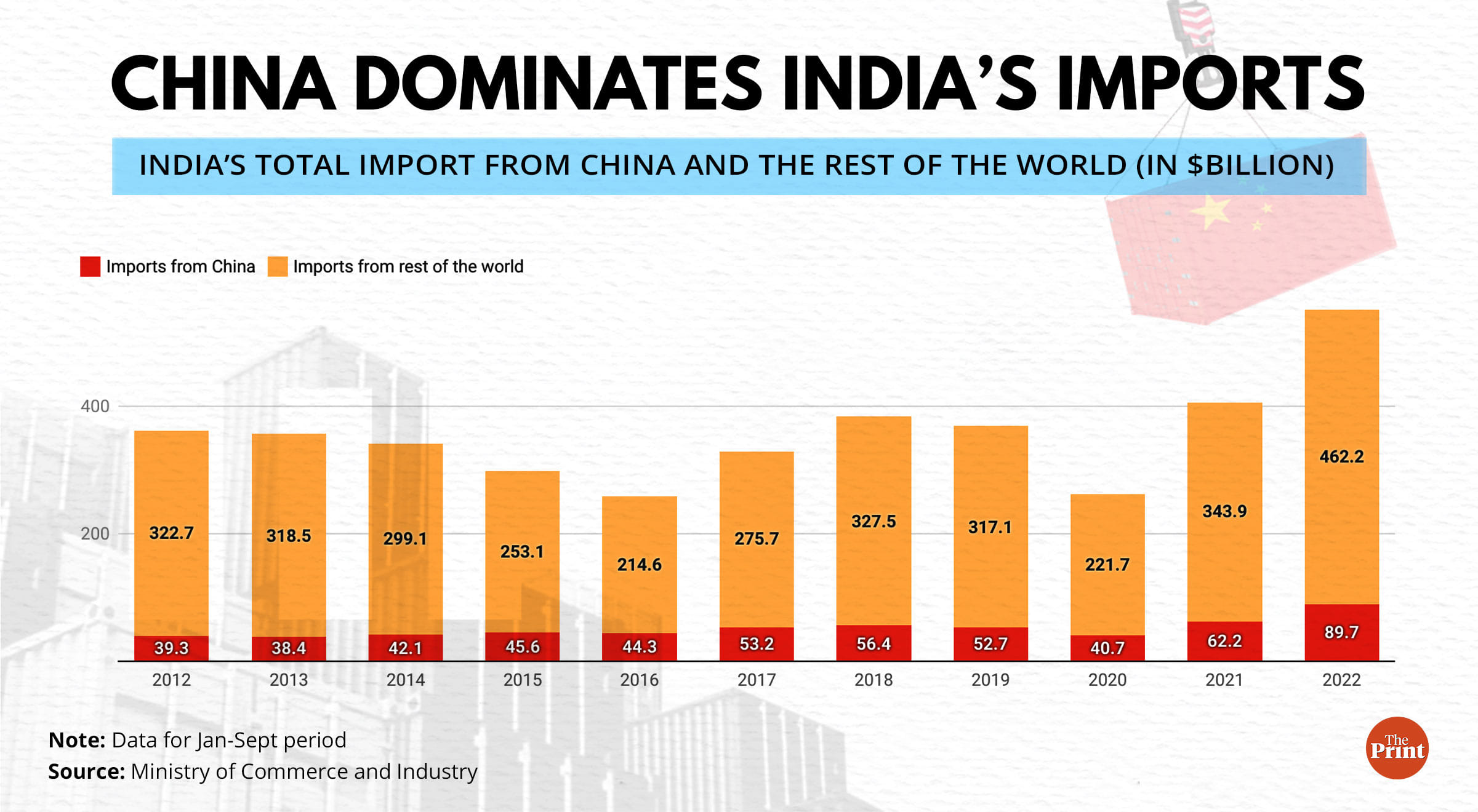 The growth in imports of Chinese goods is significantly higher than the growth of India’s overall imports. Between January and September 2022, India’s total import bill was about $551.8 billion, which is a 35 per cent jump from last year’s import bill of $406 billion.