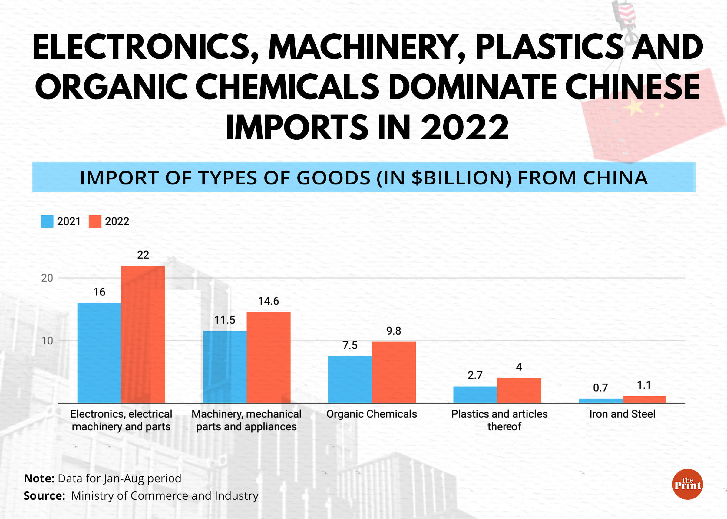 Similarly, imports of plastics and their articles from China are also disproportionately higher in 2022. India imported around $4 billion worth of plastics in January-August 2022 compared to $2.7 billion in the same period of 2021, according to the ministry.