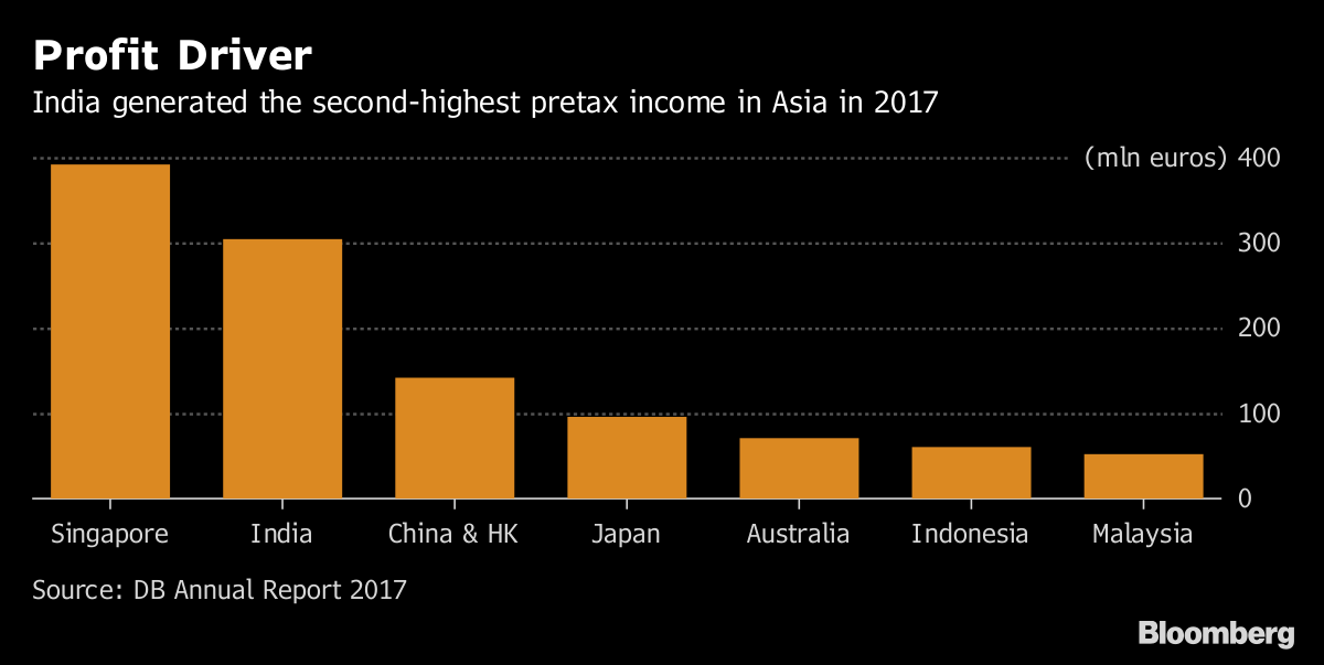 Deutsche Bank had 15.2 billion euros ($17.7 billion) of credit risk exposure in India as of December, making up about 16 per cent of its total across Asia-Pacific markets, according to its 2017 annual report. That included lending commitments and traded bonds and debt. By comparison, Japan accounted for 17.3 billion euros while China and Hong Kong made up 16.5 billion euros.