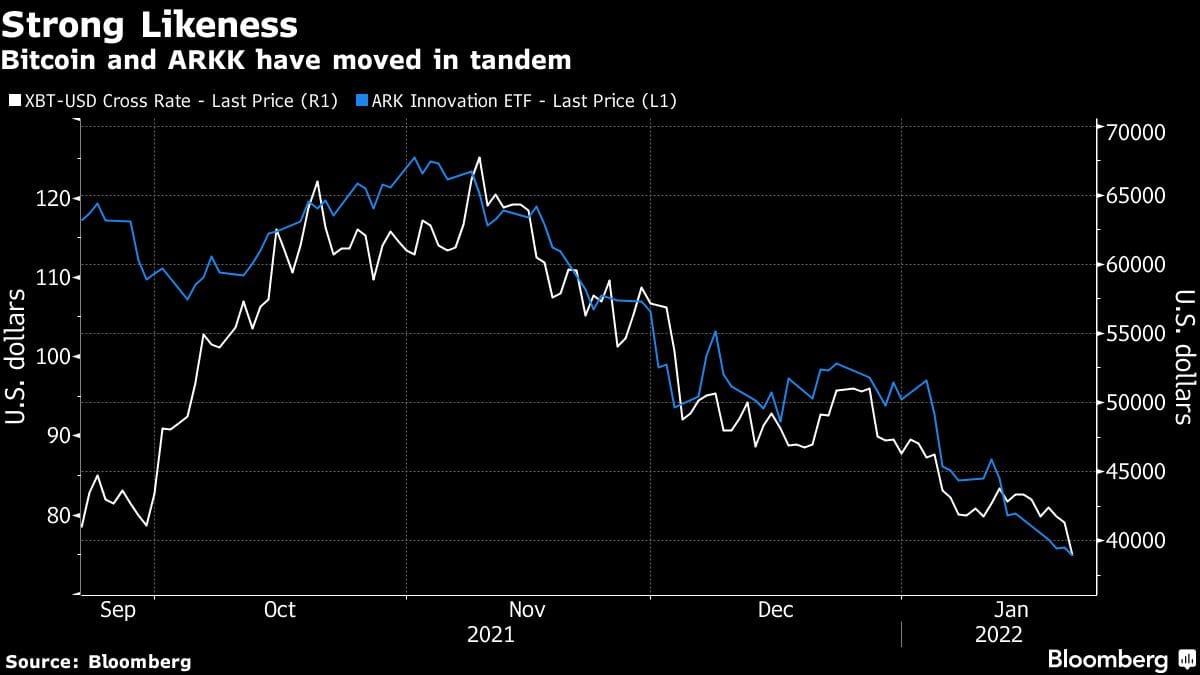 Take also the correlation between Bitcoin and Cathie Wood’s ARK Innovation ETF (ticker ARKK), a pandemic poster-child of speculative risk-taking. That correlation stands at around 60% year-to-date, versus about 14% for the price of gold, according to Katie Stockton, founder and managing partner of Fairlead Strategies, a research firm focused on technical analysis. It’s “reminding us to categorize Bitcoin and altcoins as risk assets rather than safe havens,” she said.