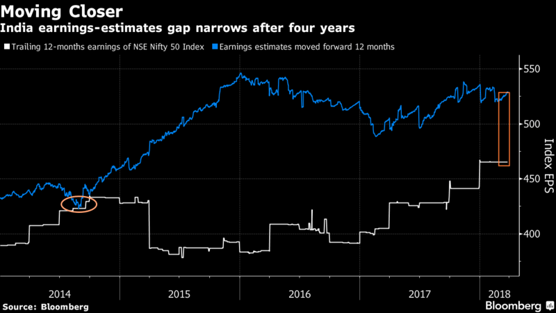 As usual, analysts are predicting a profit bounty for Indian firms. Net income among NSE Nifty 50 Index companies is set to rise 25 percent in 2018, they say, catching up with a rally that added $822 billion to prices last year. What’s cheering bulls today is that analysts have gotten a little better at their jobs.