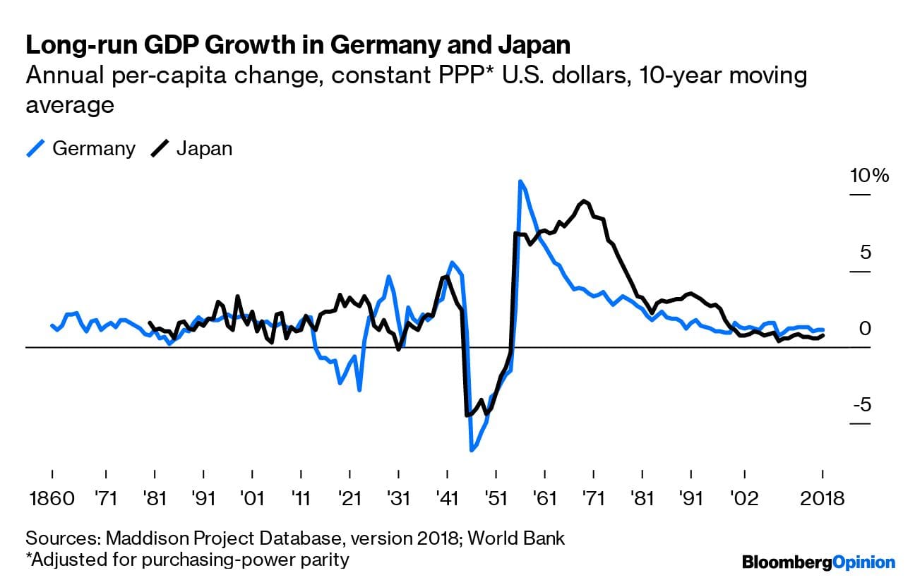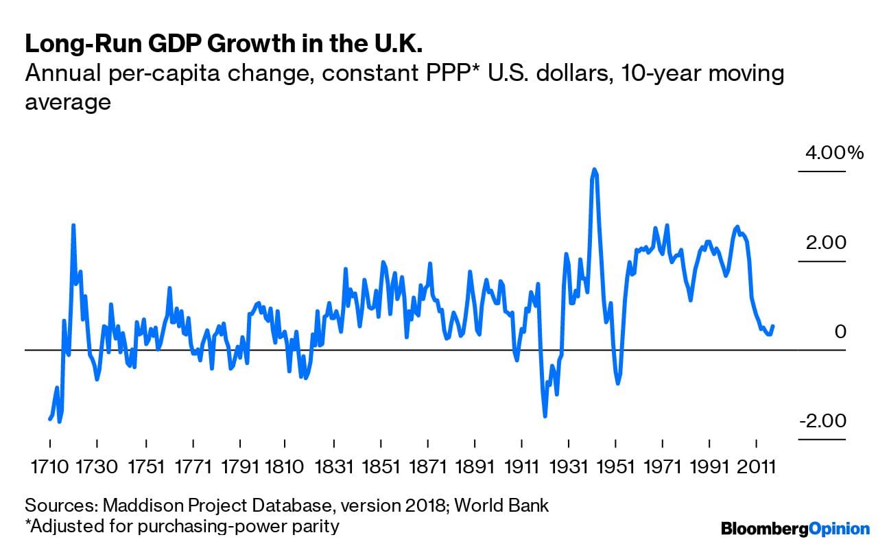Growth is sputtering all over the world. Germany and the U.K. have both reported that their economies shrank in the second quarter, and signs of a slowdown are apparent in lots of other places. But as central bankers gather in Jackson Hole, Wyoming, and government leaders in Biarritz, France, to discuss what to do, it seems worth pointing out how slow growth already was in most rich countries even before the recent bad news. Historically slow, in the case of the U.K.: