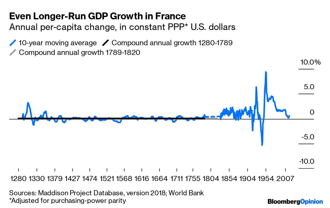 The pre-1800 numbers are pretty noisy, which is why I decided to calculate the annual growth rate from 1300 to 1800; at 0.04% a year, it really wasn’t much. I did something similar for France, where there are no estimates for the three decades following the Revolution of 1789 but there are numbers going back all the way to 1280.