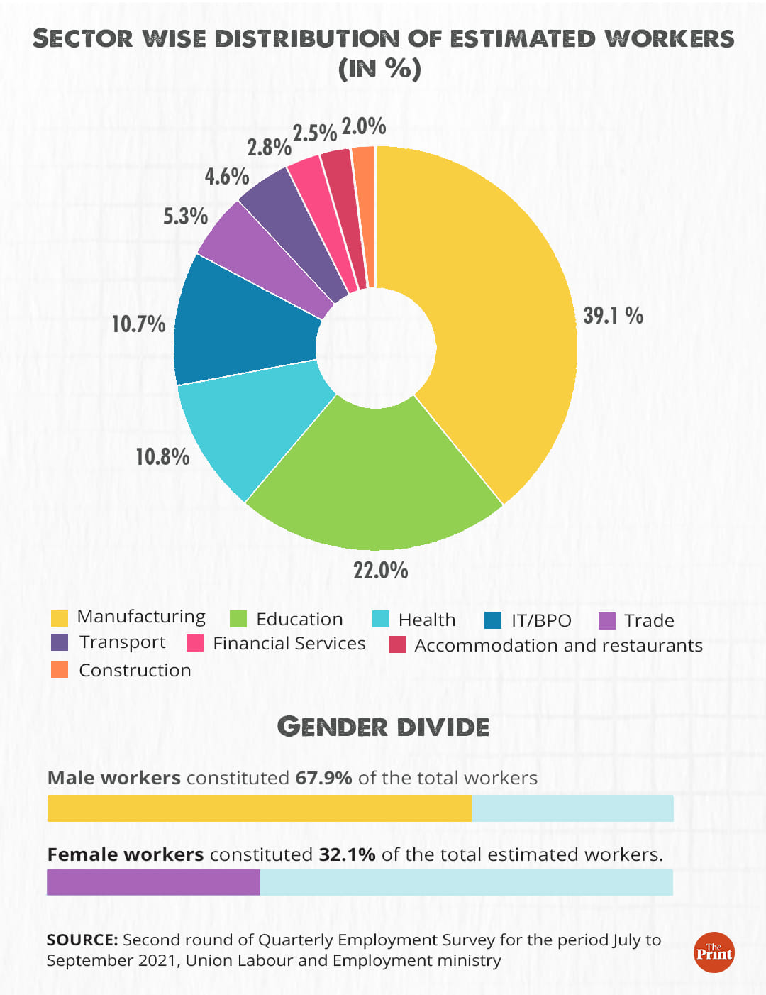 New Delhi: The estimated number of jobs in nine key sectors, including manufacturing, education, health and the IT/BPO sector, increased by two lakh to reach a total of 3.10 crore between July and September 2021 as the second wave of the Covid-19 pandemic subsided, compared to the previous quarter, according to the second round of the Union labour ministry’s quarterly employment survey (QES) released Monday.