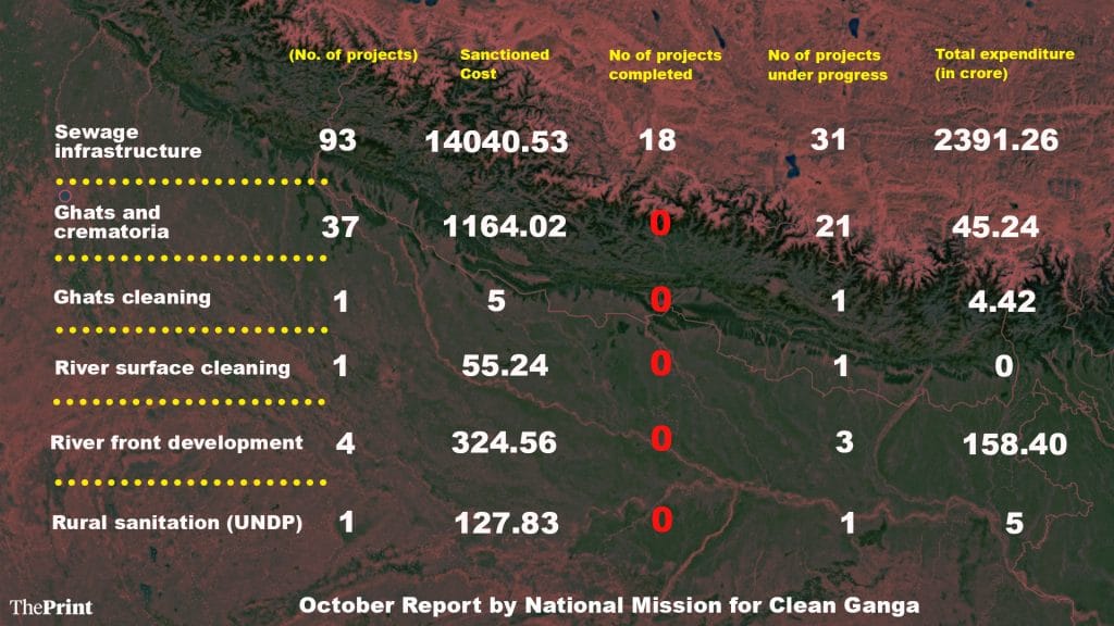 Zero projects have been completed under rural sanitation, afforestation, biodiversity conservation, and riverfront development, according to the latest National Mission for Clean Ganga (NMCG) report (31 December 2017).