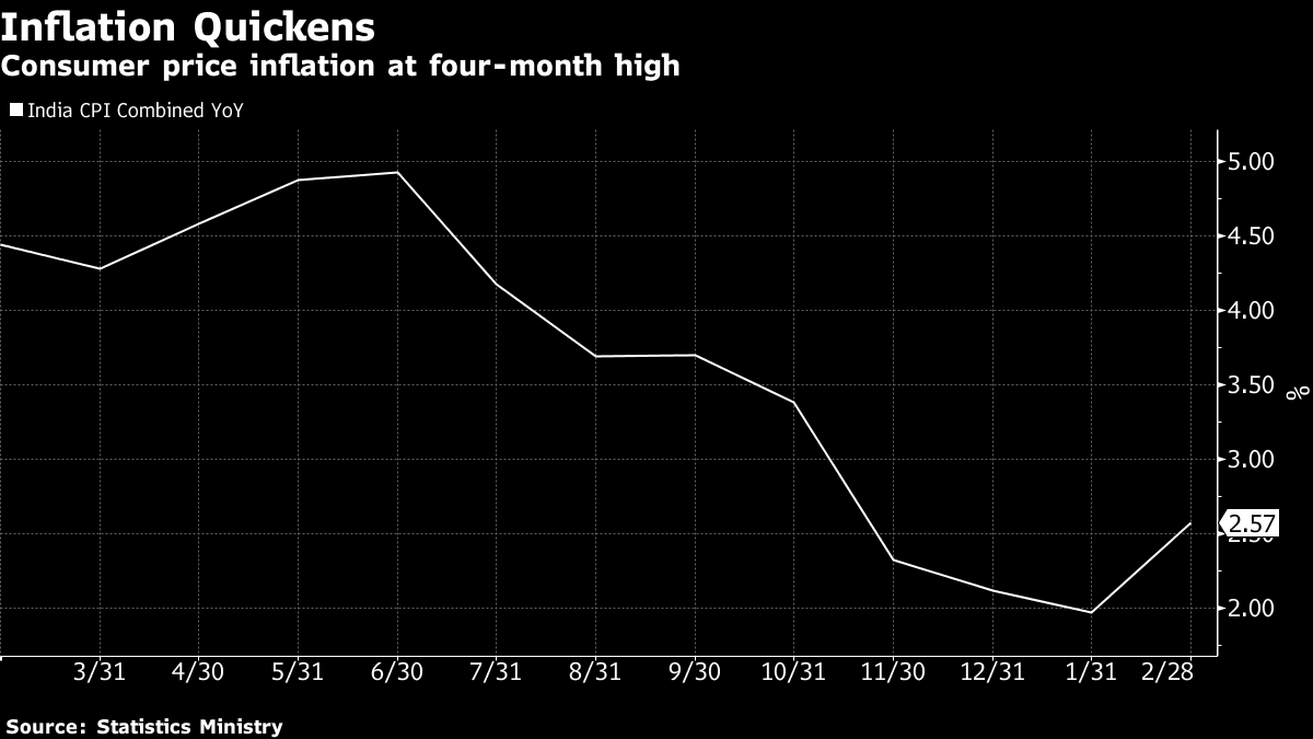 Inflation has slowed sharply since last year because of a fall in food prices, and remains well below the Reserve Bank of India’s 4 per cent medium-term target. The central bank is forecasting inflation of 2.8 percent in the January-March quarter This is the last inflation print before the April 4 interest-rate decision and ahead of general elections that kick off next month. Calls are growing for the RBI to lower interest rates again after it surprised with a 25 basis-point reduction in February Governor Shaktikanta Das has expressed concerns about weakening economic growth. Indian lenders haven’t fully passed on the last interest rate cut to borrowers, adding pressure on the RBI to loosen policy further While softer inflation bolsters Prime Minister Narendra Modi in his re-election bid, subdued food prices also mean distress for farmers, a key voting bloc