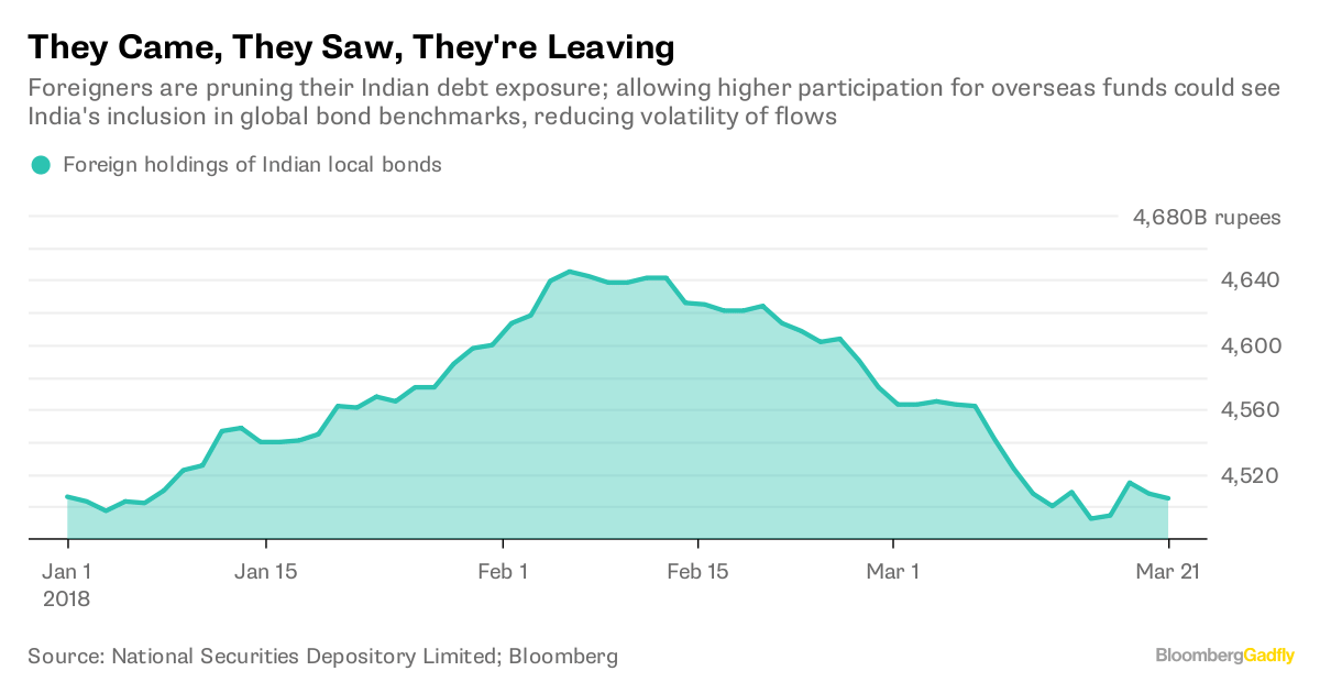 India is debating whether to open the country’s debt markets wider to foreigners, to as much as 8 percent of outstanding bonds, from 5 percent currently. A 1 percentage point increase in the limit may attract 800 billion rupees.
