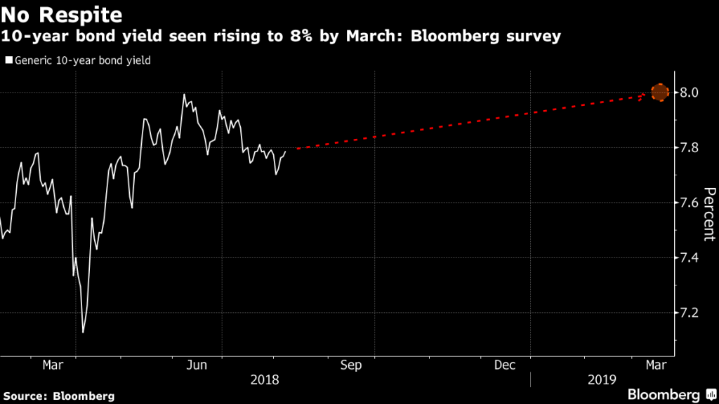 The locals polled in the survey said headwinds remain, most notably from the price of oil — the nation’s top import — and its impact on public finances. ING Bank NV was the most bearish, predicting the yield will climb as high as 8.30 per cent by year-end.