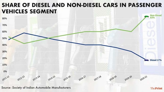 New Delhi: Less than a decade ago, there were as many diesel cars on Indian roads as petrol cars. In fact according to data from the Society of Indian Automobile Manufacturers (SIAM), diesel passenger vehicles (PVs) had a 58 per cent market share in the fiscal 2012-13, the highest proportion ever. The cheaper cost of diesel compared to petrol made consumers disregard the fact that the former causes more pollution than the latter. At the time, on average, diesel used to cost about Rs 20-25 less per litre than petrol.