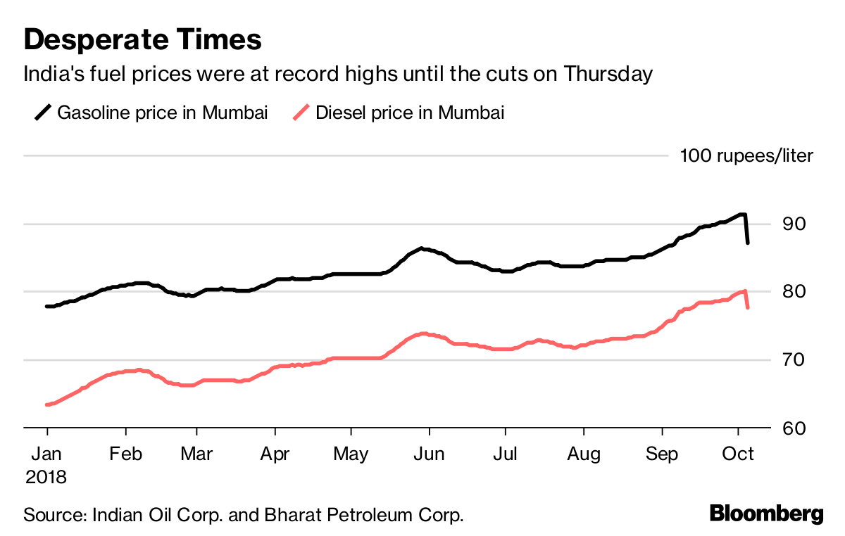 The move comes amid public anger over rising pump prices and in the run up to elections in some key provinces later this year and a national ballot in 2019, when Prime Minister Narendra Modi is set to seek re-election. Fuel prices in India before Thursday’s announcement had hit record highs amid rising oil and a sharp depreciation of the rupee.