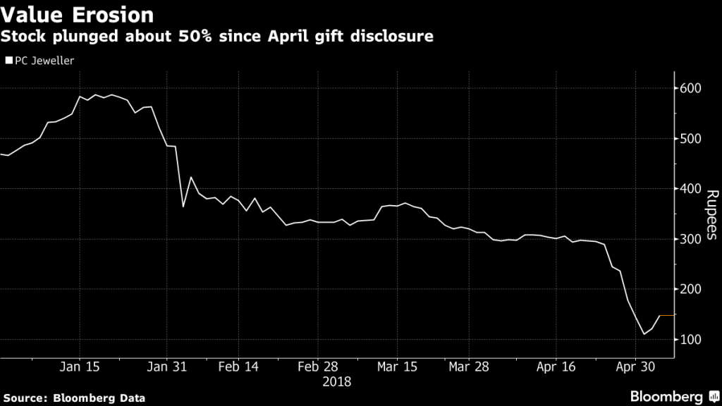 PC Jeweller Ltd. slumped by about half after the company said last week that one of its founders P.C. Gupta made the gifts through off-market transactions. The stock has plunged 75 percent from a record on Jan. 19, taking its market capitalization to 58.3 billion rupees ($873 million). It climbed 21 percent to 146.85 rupees as of 12:31 p.m. in Mumbai on Friday.