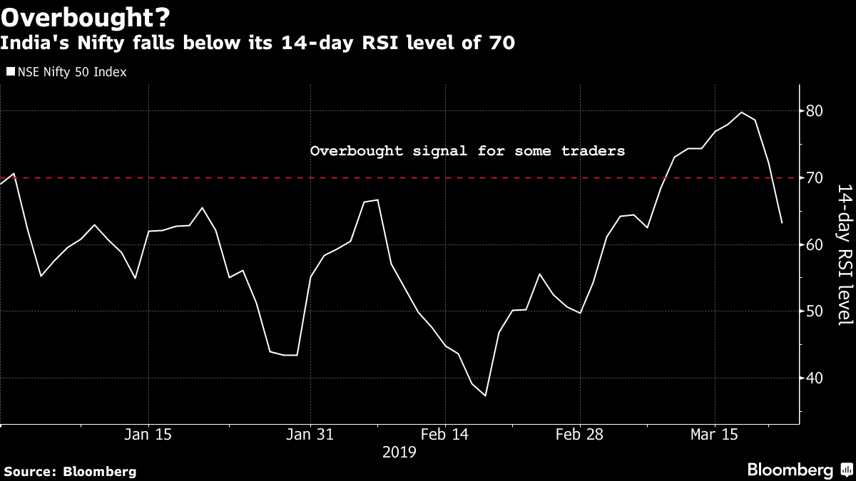 India’s equity market has been in overbought territory for the past eight days, signaling gains might have come too quickly to hold. A surge in foreign flows led to a recent rebound in local equities on bets of a revival in company earnings, low-interest rates and an increasing chance of another five-year term for Prime Minister Narendra Modi in a national poll scheduled through May.