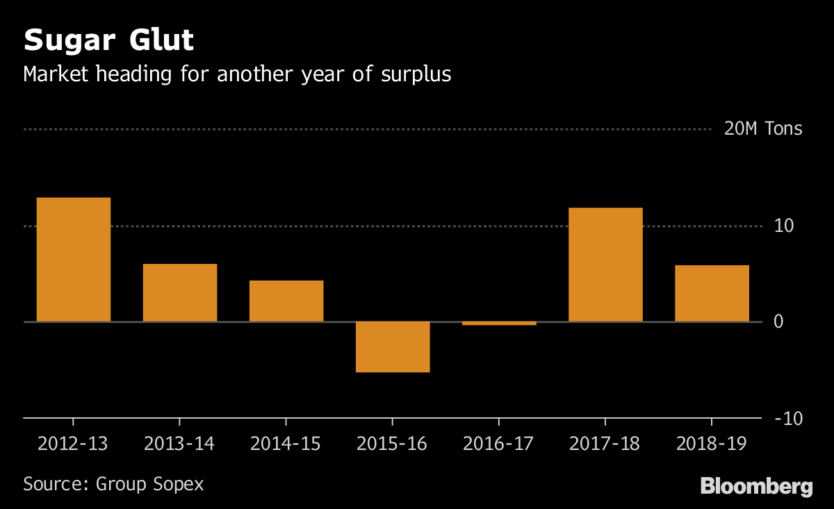 World supply will outpace demand by 5.8 million metric tons this season, following a massive surplus of 11.8 million tons a year earlier, according to Sopex. Much of that is down to large production in countries like India and Thailand, and there’s now no limit on European output after quotas were scrapped in 2017.