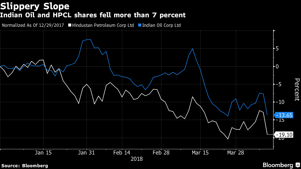 Companies including Indian Oil Corp., Bharat Petroleum Corp. and Hindustan Petroleum Corp. will have bear a loss of up to 1 rupee per liter on sale of diesel and gasoline, the people said asking not to be identified as the matter is private. Shares of Indian Oil fell as much as 7.6 percent in Mumbai, the most since November 2016 in intraday trading, while HPCL lost as much 8.3 percent.
