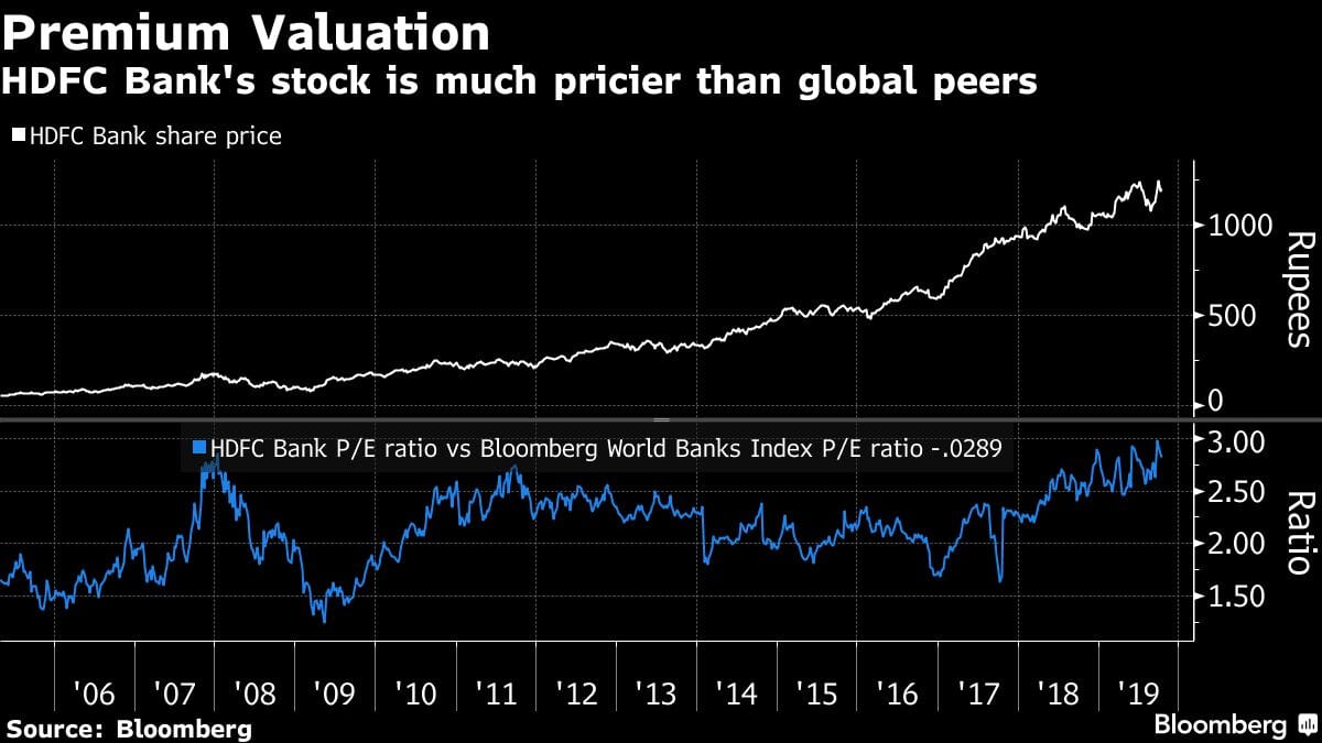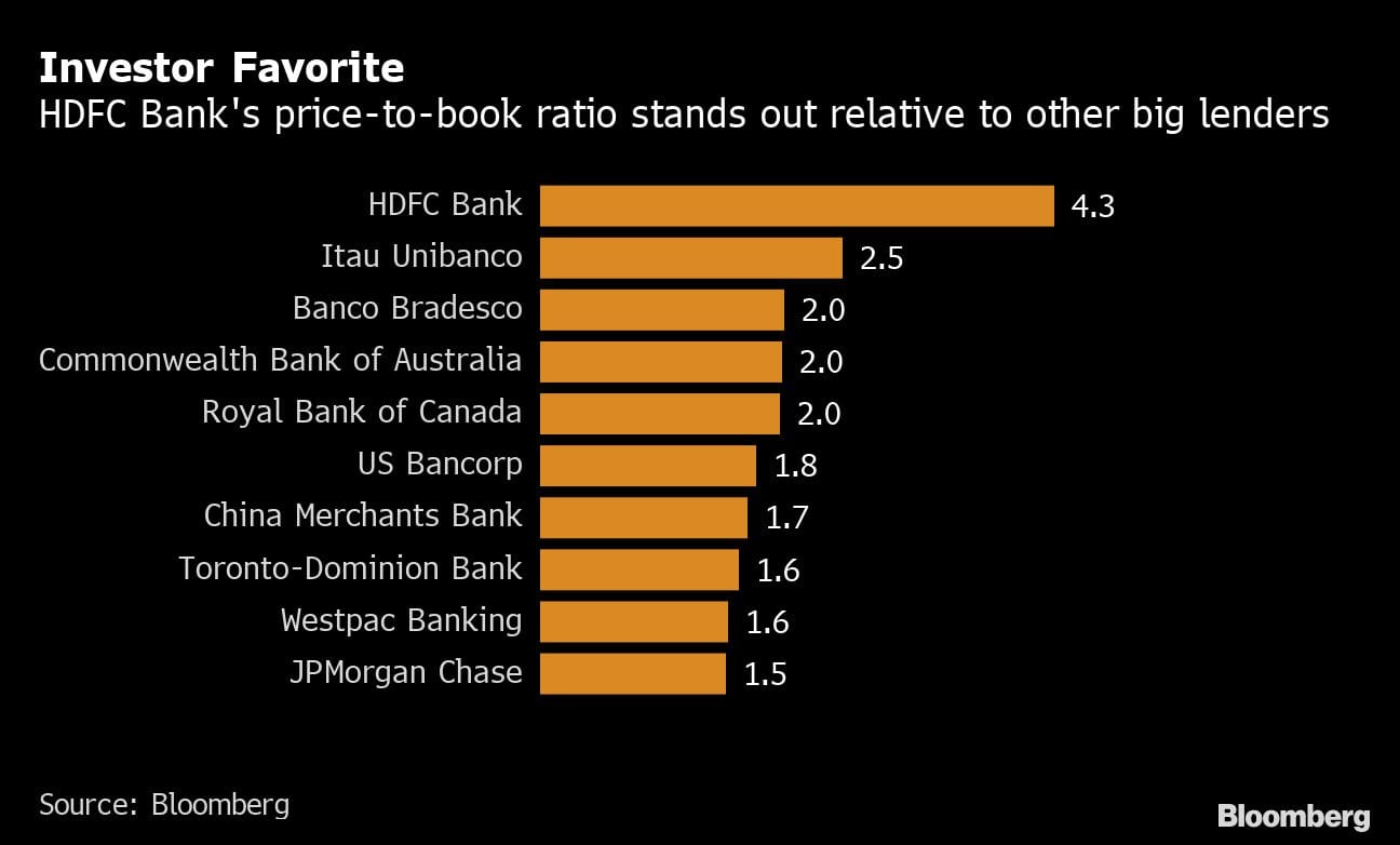 All the while, HDFC Bank’s stock price has marched higher. Now valued at about $92 billion, the company trades for 24 times projected earnings over the next 12 months. That’s almost three times more expensive than the Bloomberg World Banks Index, within a hair’s breadth of the biggest valuation premium on record. The company’s price-to-book ratio of 4.3 compares with 1.5 at JPMorgan Chase & Co., the biggest U.S. lender by market capitalization.