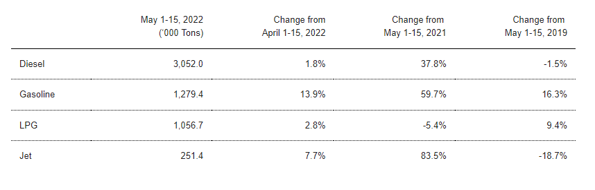 Pump prices have also remained unchanged since early April following a series of increases from state-run refiners after the end of local elections. Diesel sales, meanwhile, rose 1.8% month-on-month to 3.05 million tons.