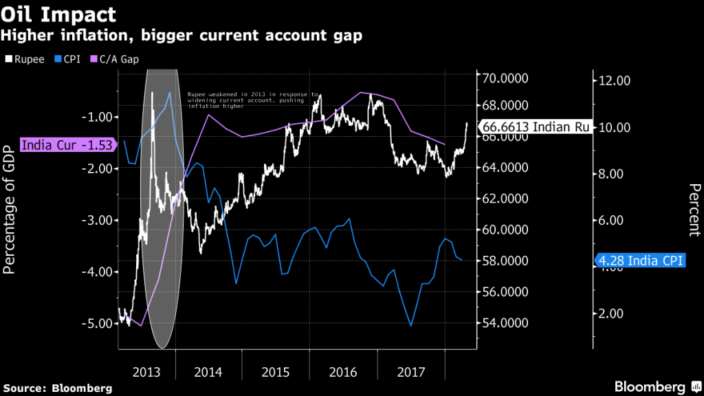 The rupee is Asia’s worst performing currency this year on concerns that slowing capital flows and a wider trade deficit could stretch the funding of India’s current account gap. That raises the specter of 2013 when vulnerable external accounts saw the rupee plunge to record lows amid the Federal Reserve’s signal that it would gradually withdraw some of the extraordinary monetary policy accommodation.