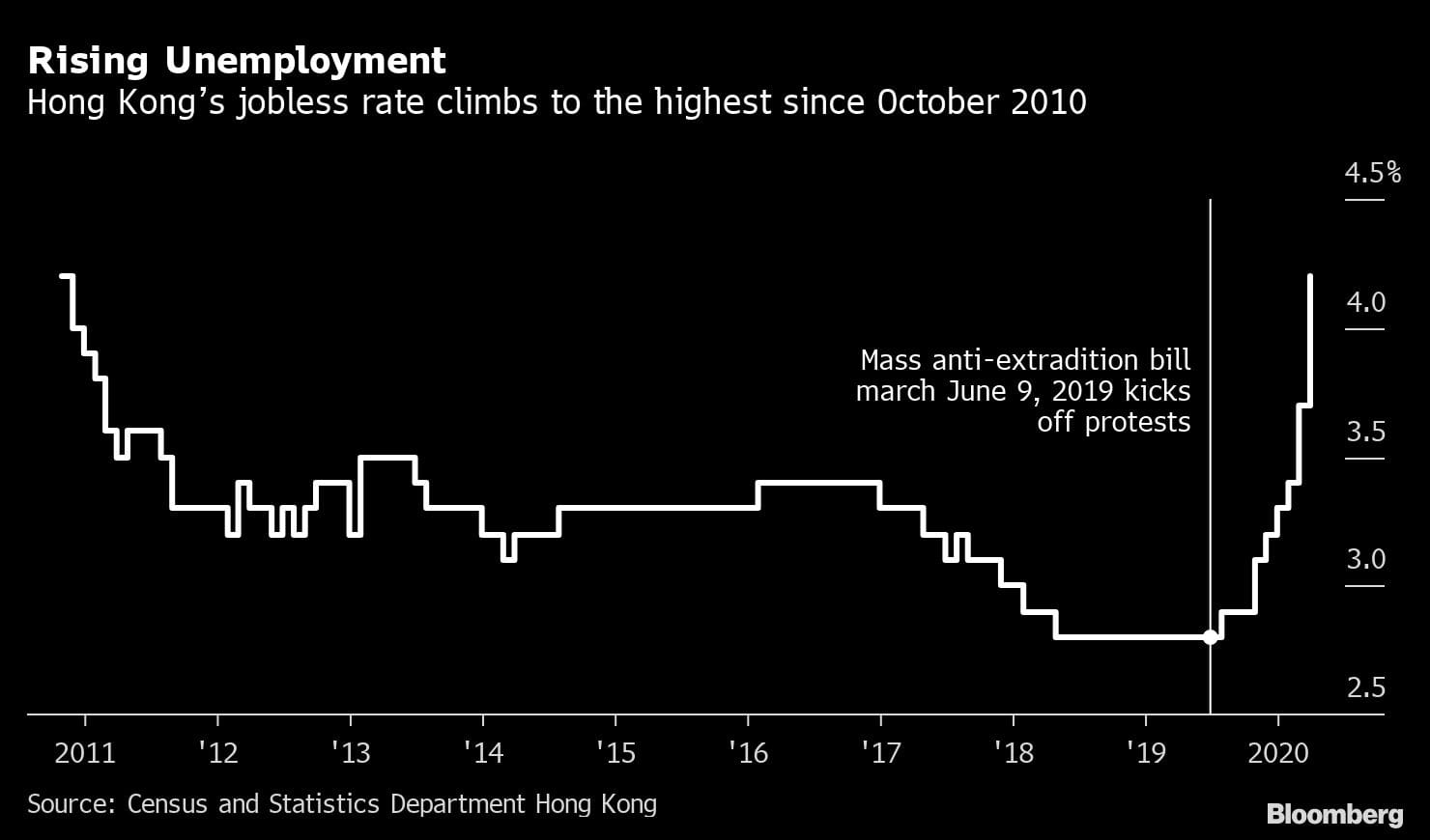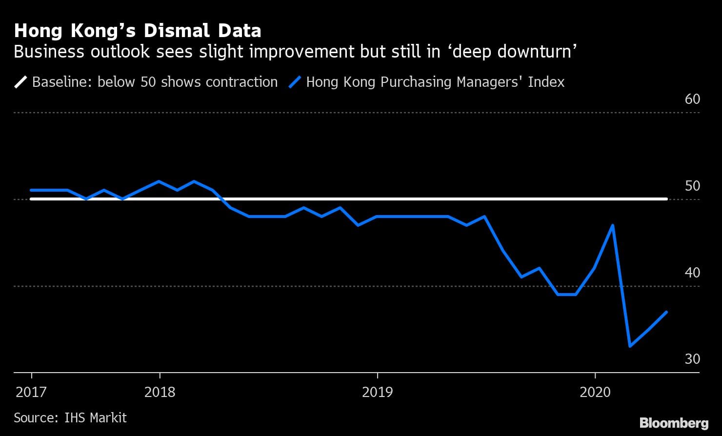 Government officials warn the city may see its worst full-year economic performance on record, with a contraction of as much as 7%, after the economy shrank 1.2% last year. It contracted 8.9% in the first quarter from year-ago levels. Unemployment has risen for six straight months while industry barometers including small business sentiment and Markit PMI hover near record lows.