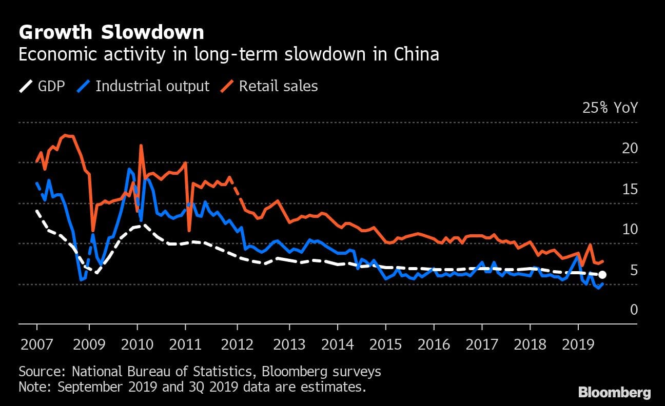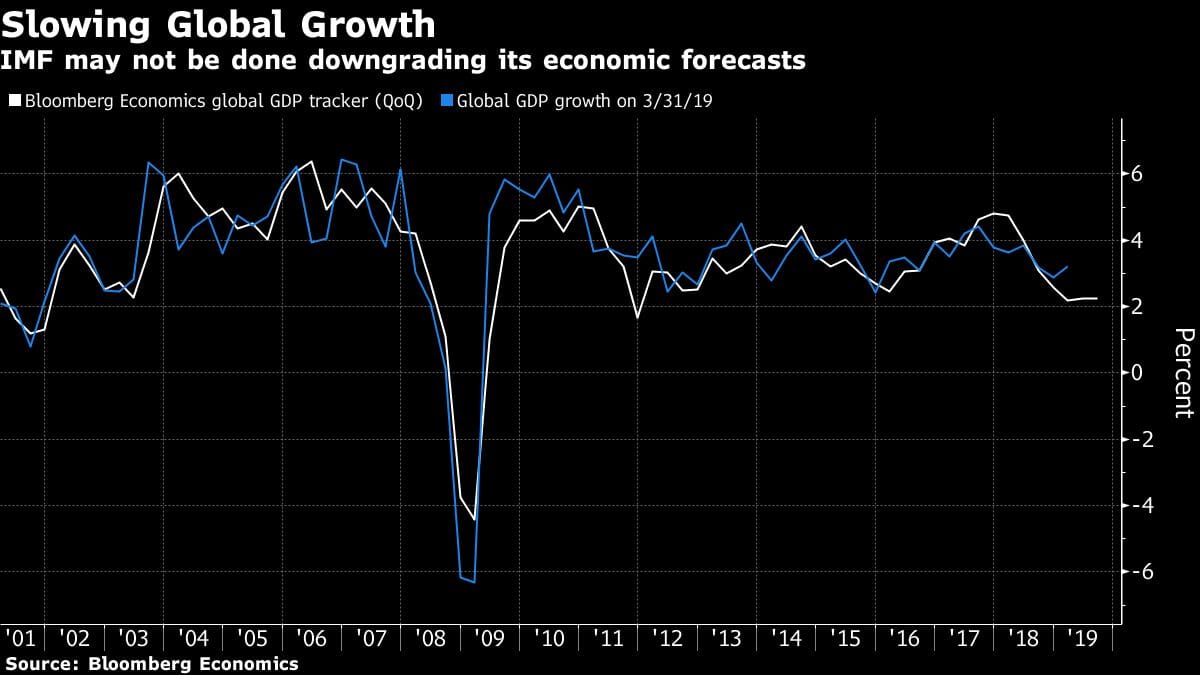 There will certainly be discussions this week at the International Monetary Fund’s annual meeting in Washington. Bloomberg Economics’ global GDP tracker shows the pace of expansion has slowed to 2.2% in the third quarter, down from 4.7% at the start of 2018.