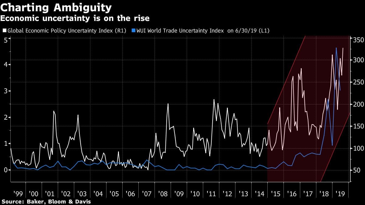 As well as the U.S.-China skirmish, the U.K. and EU have yet to seal a Brexit deal. The U.S. is at odds with Iran after a drone attack on Saudi Arabian oil fields and an Iranian oil tanker caught fire after an explosion near the Saudi Arabian port of Jeddah on Friday. That risks a jump in oil prices. Protests in Iraq have turned violent, Turkey launched an offensive in Syria and marches in Hong Kong might tip that economy into recession. Argentina is facing another fiscal crisis and looks likely to oust a market-friendly government, and Ecuador, Peru and Venezuela also have political problems. An impeachment probe into Trump as well as the 2020 election campaign could also prompt him to ramp up his anti-globalization agenda.