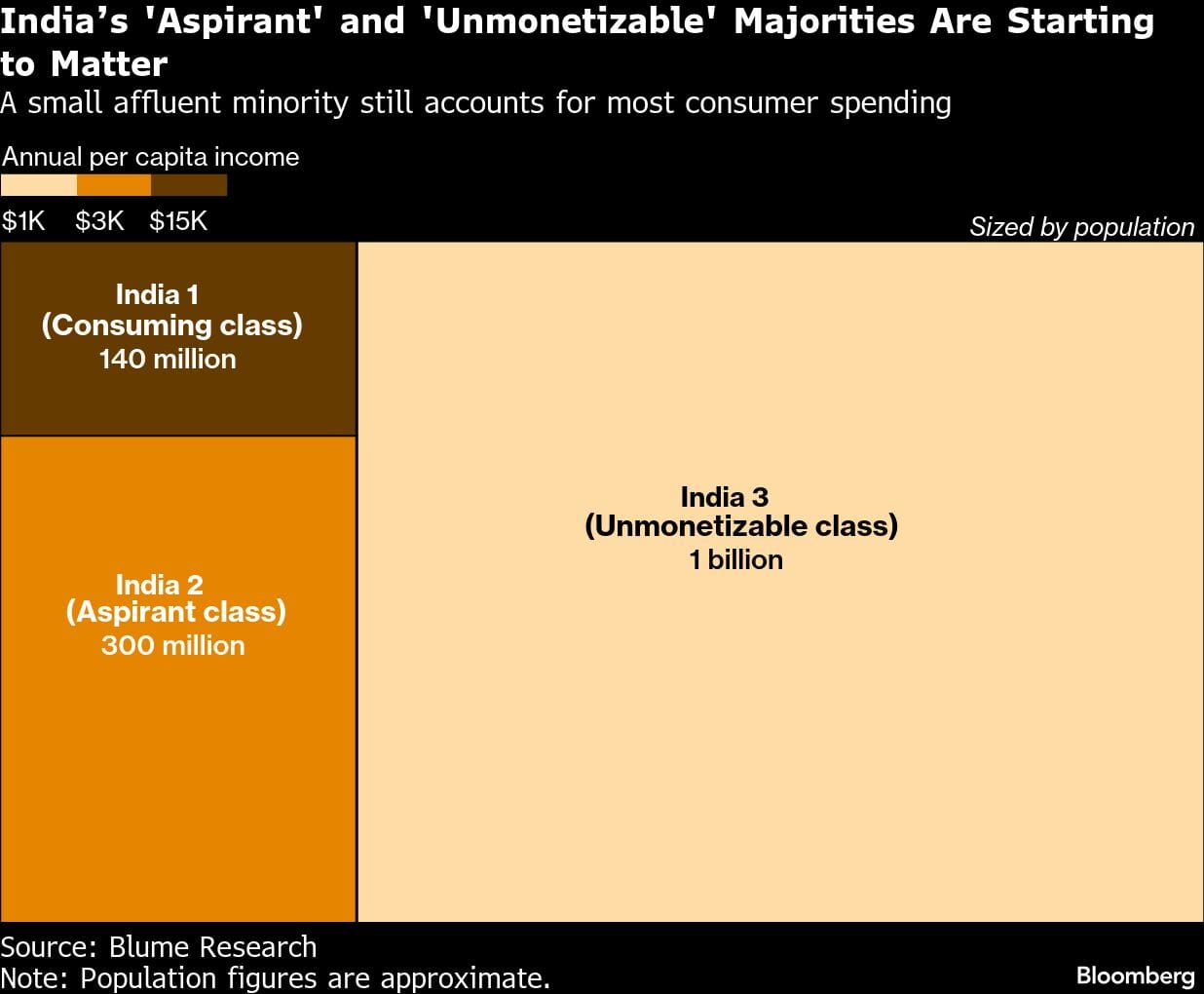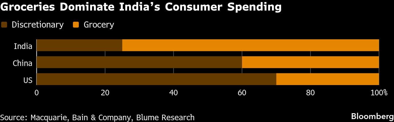 That inequality is reflected across consumer patterns: Less than 10% of Indians — around 140 million people, or 30 million households — account for the vast majority of discretionary spending — twice as much as the rest of the country put together, according to Blume Venture Advisors in Mumbai.