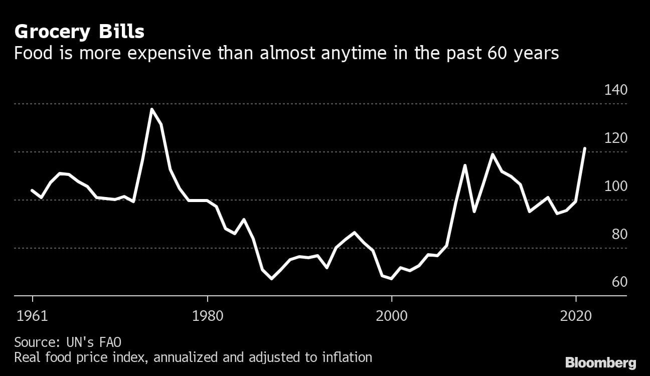 Adjusted for inflation and annualized, costs are already higher now than for almost anytime in the past six decades, according FAO data. Indeed, it’s now harder to afford food than it was during the 2011 protests in the Middle East that led to the overthrow of leaders in Tunisia, Libya and Egypt, said Alastair Smith, senior teaching fellow in global sustainable development at Warwick University in the U.K.