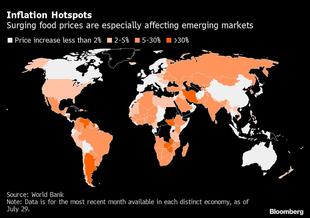 Global food prices were up 33% in August from a year earlier with vegetable oil, grains and meat on the rise, data from the United Nations Food and Agriculture Organization show. And it’s not likely to get better as extreme weather, soaring freight and fertilizer costs, shipping bottlenecks and labor shortages compound the problem. Dwindling foreign currency reserves are also hampering the ability of some nations to import food.