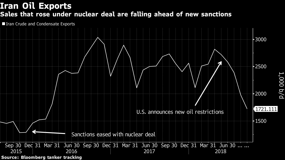 OPEC’s third-largest producer was pumping close to 4 million barrels a day earlier this year, with about 2.5 million of that going to exports. This changed after U.S. President Donald Trump said in May that he was pulling the U.S. out of the Iran nuclear accord and planned to reinstate sanctions on the country’s energy industry. An earlier round of sanctions under former President Barack Obama slashed Iran’s oil exports by about half, to roughly 1 million barrels a day, from 2012 through 2015. Trump’s stated aim is to cut Iranian sales to zero, and while the curbs won’t take effect until Nov. 4, they’re already scaring away buyers.